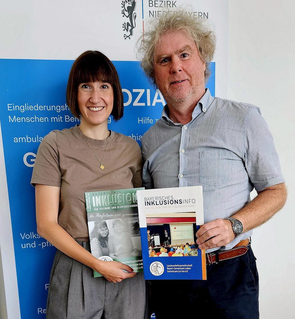 Im Bild: Bezirksrat und Beauftragter für Menschen mit Behinderung Markus Scheuermann und seine Fraktionskollegin Stefanie Auer präsentieren zwei Inklusions-Hefte von 2012 und 2025