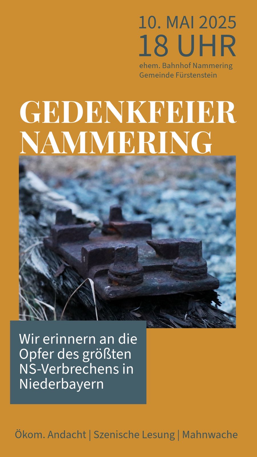 Ich möchte euch dazu herzlich einladen: Am ehemaligen Bahnhof Nammering, Gemeinde Fürstenstein, Samstag, 10.Mai 2025 (Beginn 18:00 Uhr). Im Anhang findet ihr die Sharepics zur Veranstaltung.