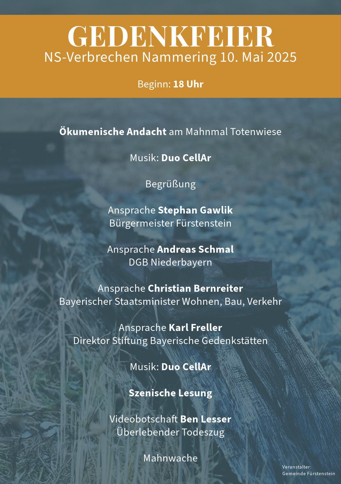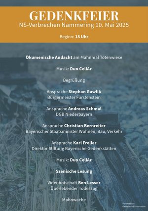 Am Bahnhof Nammering fand im April 1945 das größte NS-Verbrechen in Niederbayern statt. Ein "Evakuierungszug" aus dem KZ Buchenwald mit 5009 Gefangenen hatte hier, aufgrund beschäftigter Gleise auf der weiteren Bahnstrecke, einen 5-tägigen Aufenthalt auf dem Weg nach Dachau. Zurück blieben 794 ermordete Menschen, verscharrt in einer sumpfigen Wiese oder verbrannt in einem nahegelegenen Steinbruch. Zum 80. Jahrestag gedenken wir der Opfer in einer großen Feier.