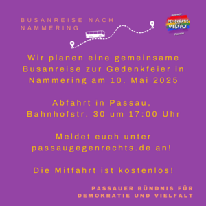 Es gibt auch einen Shuttelbus ab Passau mit mehreren Zustiegsmmöglichkeiten, organisiert vom Bündnis für Demokratie und Vielfalt Passau (Anmeldung unter passaugegenrechts.de).